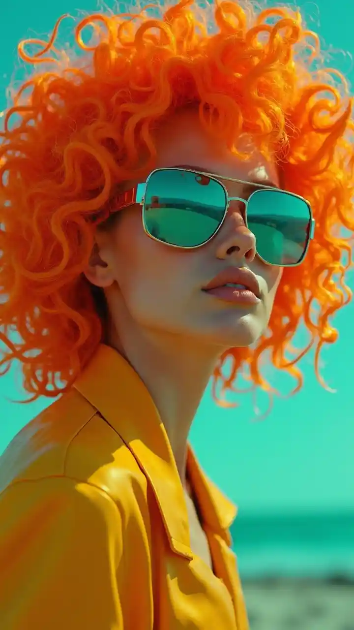 Представьте себе мир, где сочетается старинный гламур и ультрасовременная эстетика. Погрузитесь глубже в цветовую палитру, в которой доминируют электрический зеленый и огненно-оранжевый, где оттенки не только дополняют, но и усиливают друг. Субъект - фигура неоспоримого стиля и изысканности, напоминающая ретро-диву, но украшенная причудами футуристической сферы. Ключевые элементы: Волосы: объемные, кудрявые, окрашенные в неон-оранжевый оттенок, который, кажется, излучает свой свет. Он должен быть в резком контрасте с остальной частью окружающей среды. Очки: сверхразмерные солнцезащитные очки с отражающей окраской. Дизайн гладкий, смелый и вызывает чувство передовых технологий. Одежда: блестящая, плотно закрывающаяся кожа куртка в оттенке от золота или горчицы. Эта одежда должна быть сочетанием прошлой и будущей моды, выразить класс и иметь самый современный дизайн. Макияж: эфирный, с металлическими губами, которые совпадают с курткой, и зеленый тени для глаз, чтобы отражать солнцем. Кожа должна быть