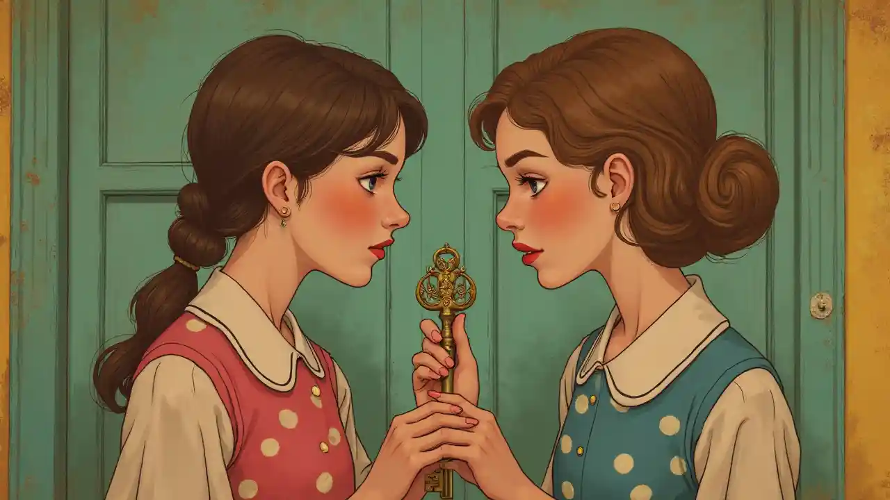 Винтажная фотография двух девушек, держащих ключ, в стиле Уэса Андерсона, невероятно детализированная, яркие цвета