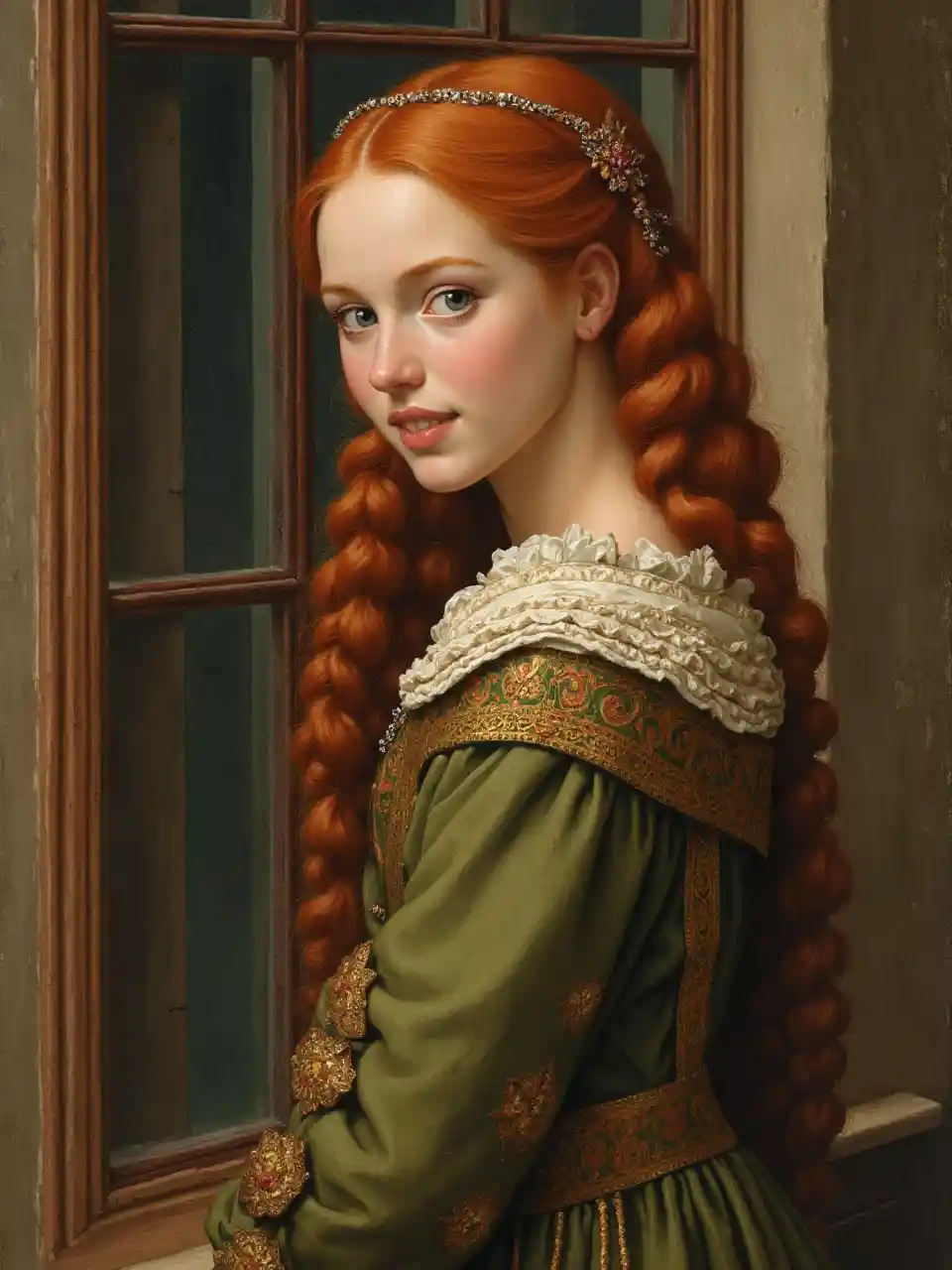 Портрет молодой рыжеволосой девушки перед окном, Винтажные платья, 15-й век, живопись, масло, Италия, СВЛ Сандро Боттичелли, иллюстрация,