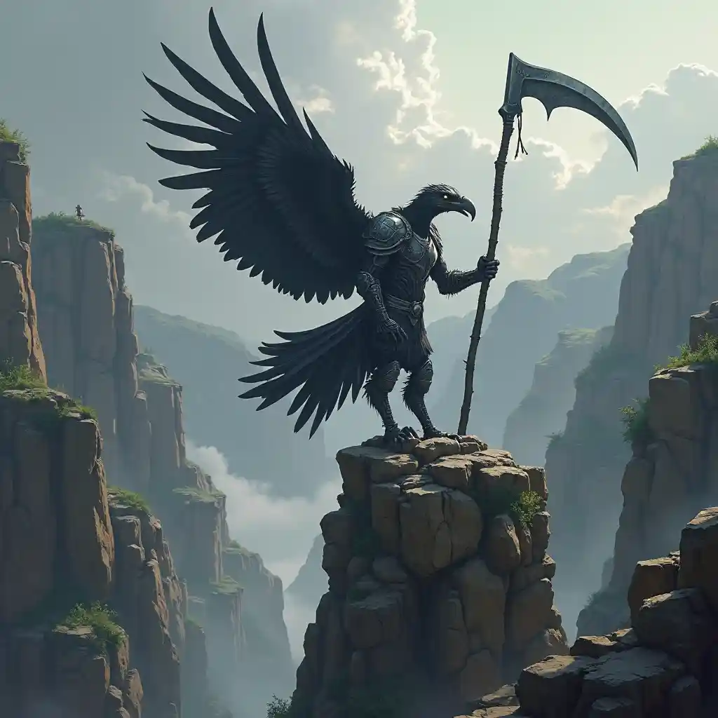 Стоя на скалах над ущельем потерянных душ, великий паладин поднимает свою косу высоко - стервятник, антропоморфный паладин стервятника в черной и серебряной доспехах... охотник на мертвых... с клювными, готов к битве. Его крылья расширены и готовы к полету