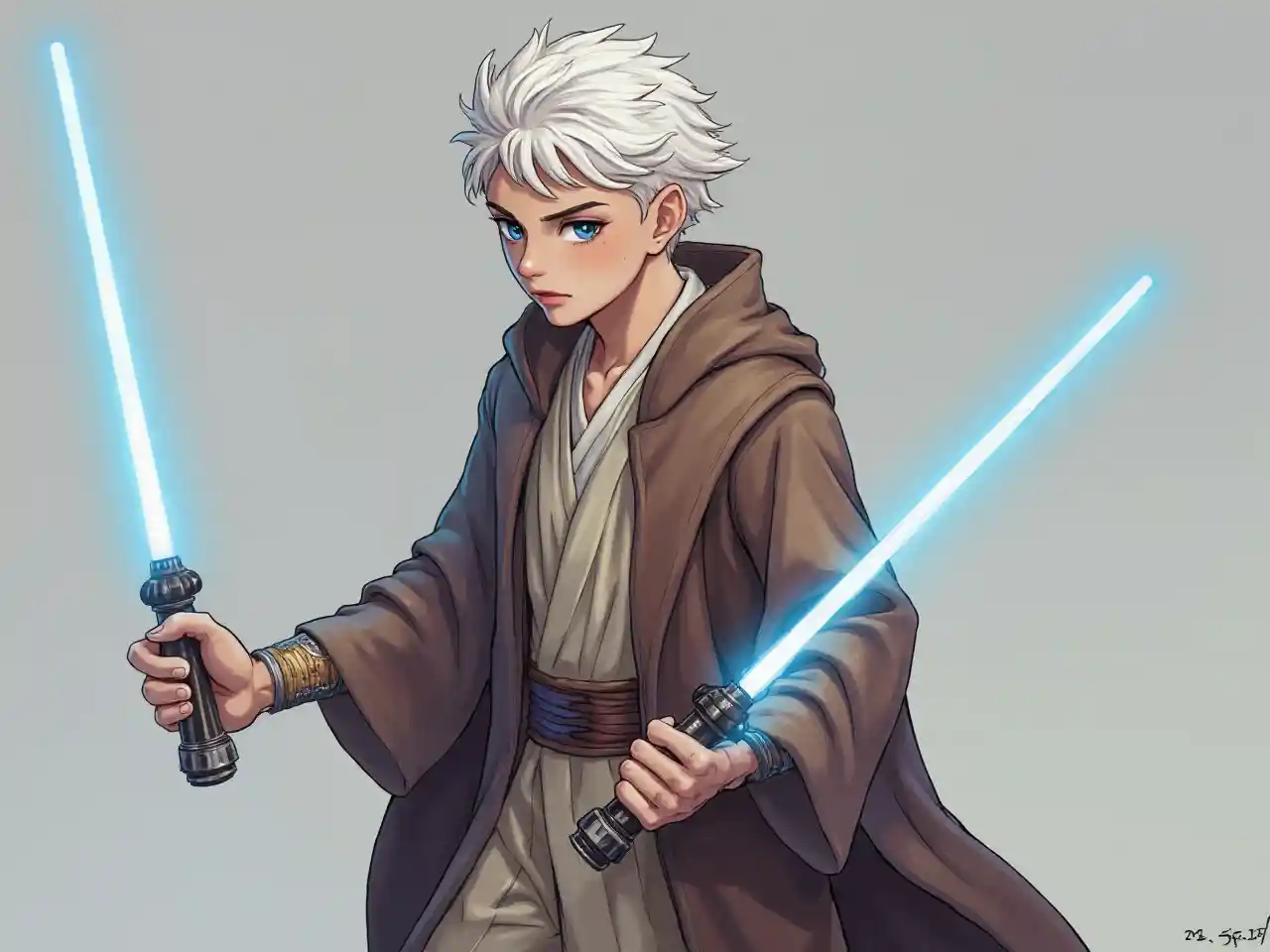 Молодой мальчик возраст: 20 Цвет кожи:белый Одежда:коричневый халат, с синим световым мечом и белые волосы