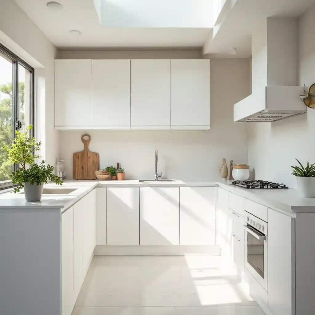 Camilaсовременная минималистическая кухня белый цвет со светом солнца, дневный свет