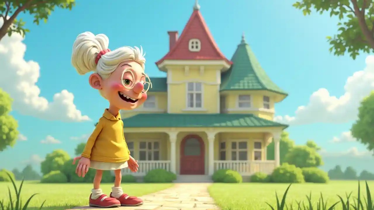 Дом в Вилле с полным видом с головы до ног смеяться жестикулируя бабушка стоит перед большим домом в стиле доктора Сьюза, смеясь жестикулируя бабушку Сьюза, одетая в контрастную одежду 3D анимация в BG дом в Вилле с экстремальным дальным видом, тема с головой до ног Небо синий фон контрастирует с известко белый абстрактные формы.