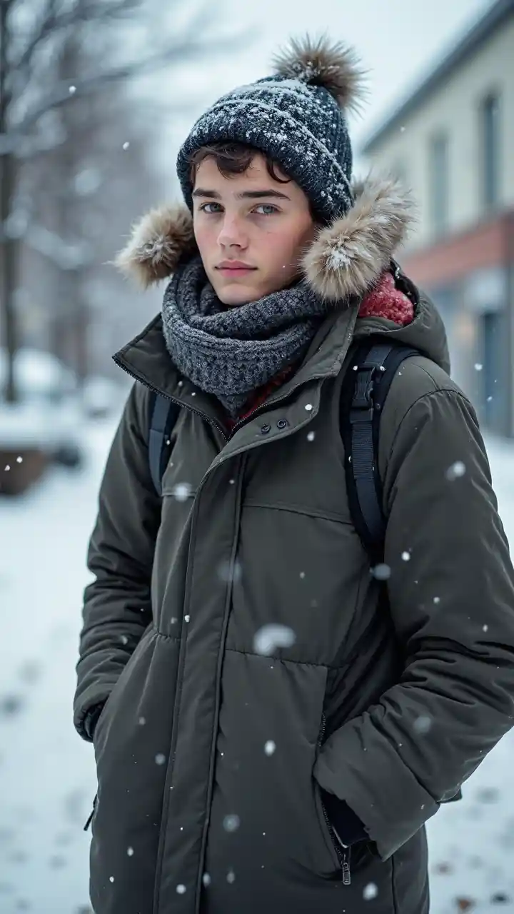 NoahМужчины-подростки в школе в зимних одеждах , замерзшие , холодно