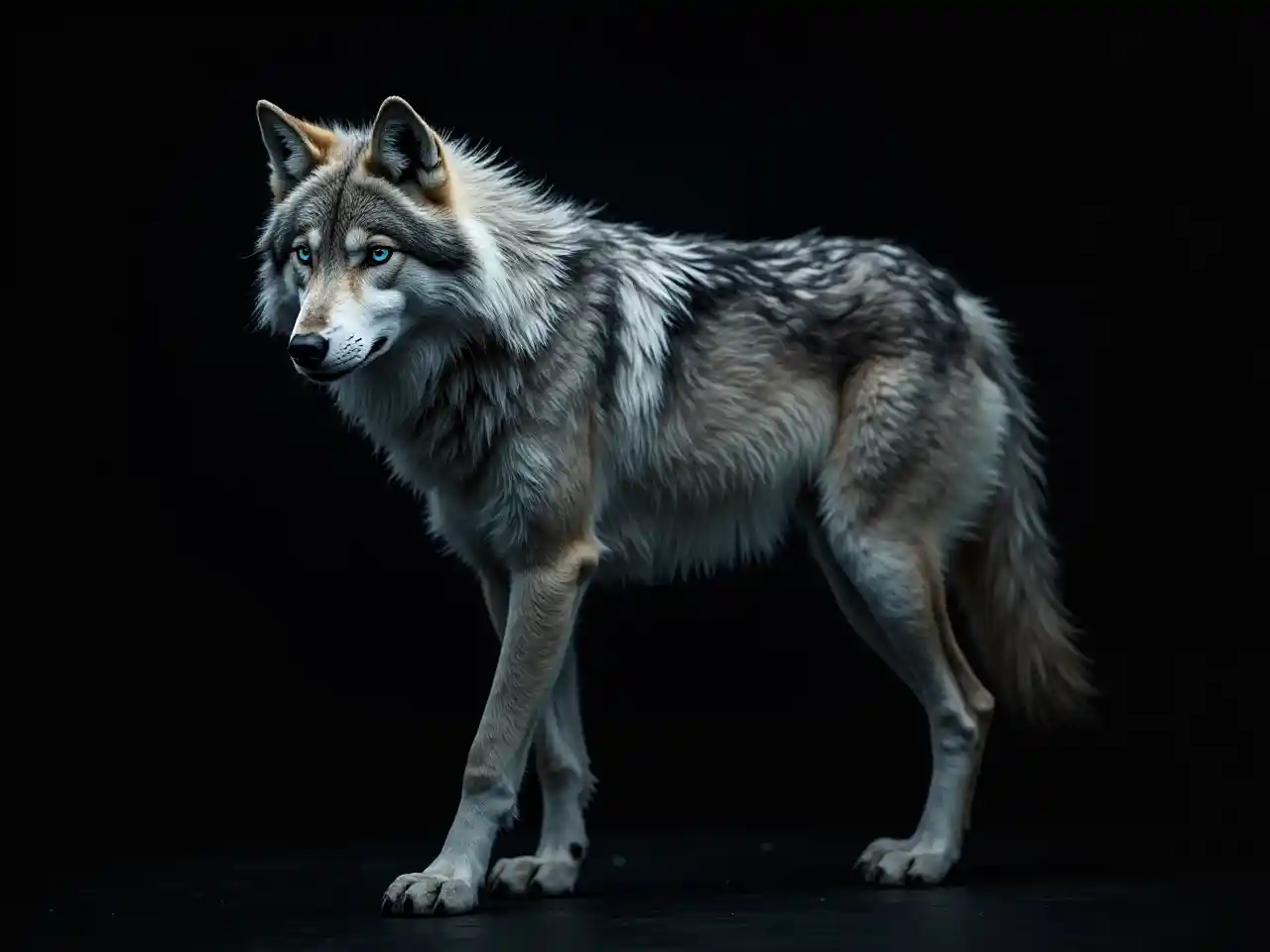 Волк с полным телом, боковой вид, поразительное серо-белое меховое покрытие, блестящее под светом, увлекательные голубые глаза, проникающие сквозь темноту, на фоне чистого черного, создающего высококонтрастный драматический эффект, подчеркивающий величественную позу и мощное присутствие волка, сверхдеталированное, высокое качество, интенсивная и захватывающая атмосфера, вызывающая чувство дичи и свободы.