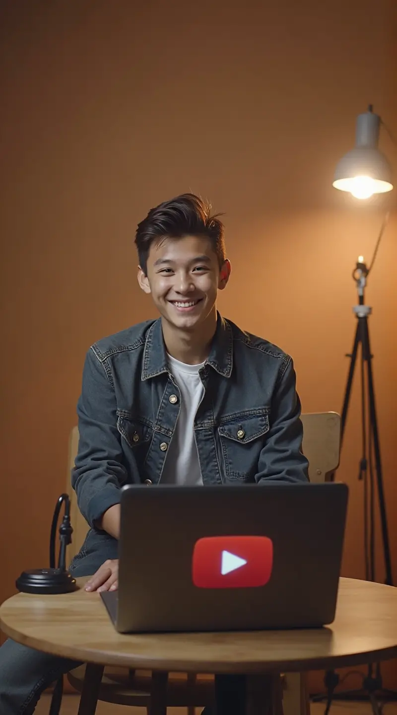25-летний мальчик сидит в студии за столом, фоновый компьютер на столе под углом портрета и лампа с кнопкой воспроизведения YouTube.