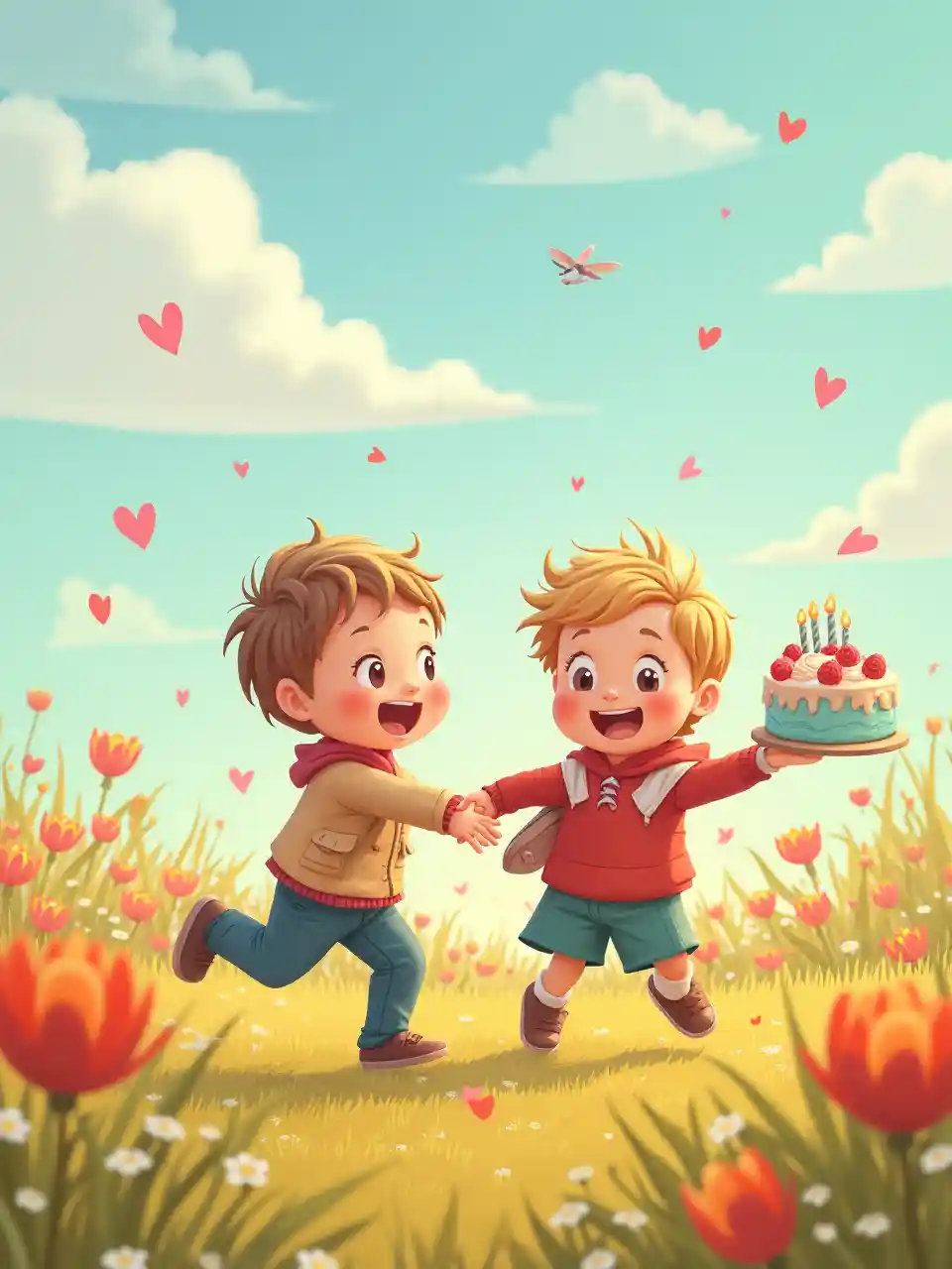 Сделай мини-рисунок, где мальчики поздравляют Юлию с днем рождения. Дай ей цветы и торт. Они радуются и бегут в поле, держась за руки. Звучит веселая музыка. В конце выходит надпись "С днем рождения Юлии!" → Переделать поздравления на русском языке. Изменить детскую одежду на русскую.