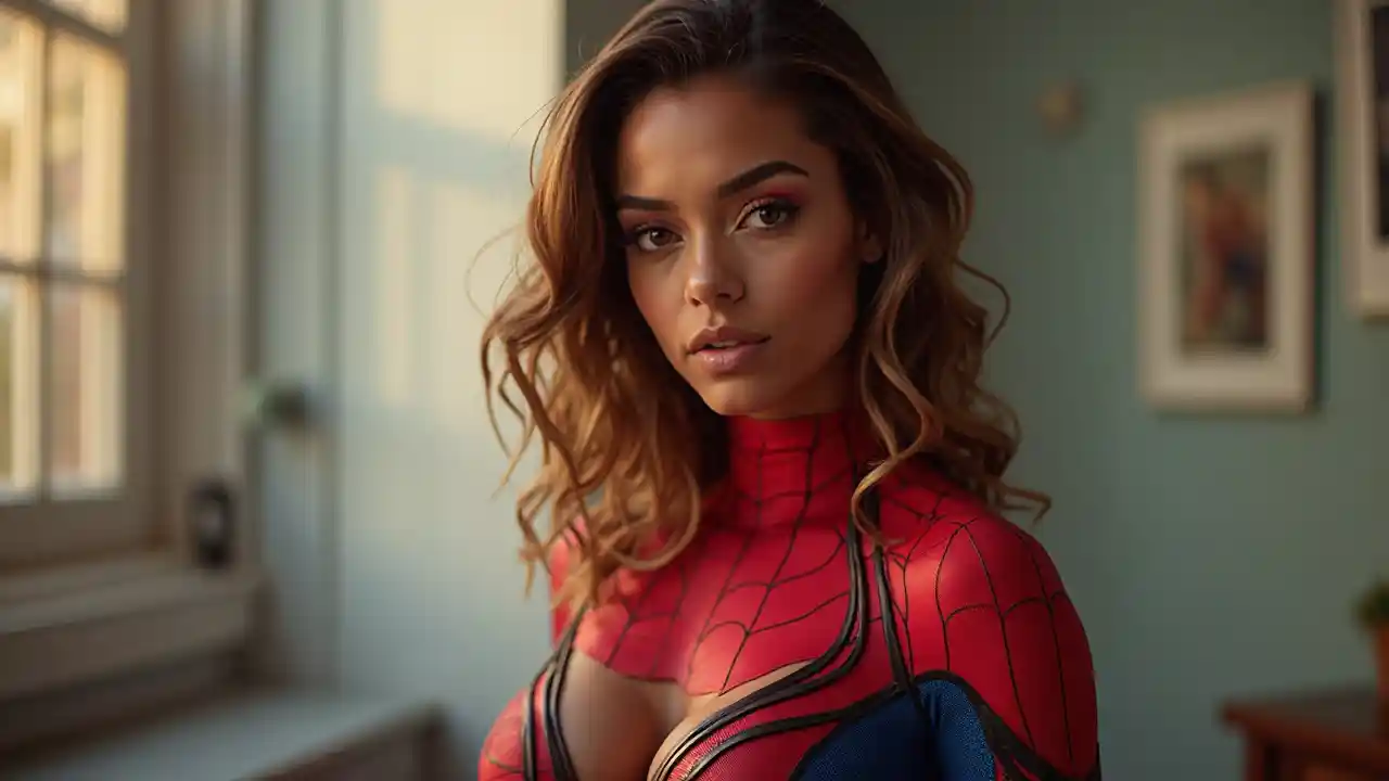 Зендая в костюме сексуального паука, фото в Инстаграме, деликат, большая грудь, портрет, человеческое подобие, Обучение персонажа, естественное освещение, Мягкий естественный свет, Дневной свет, Окружающее освещение, Изоляция субъекта, Широкая диаметра, Плоская глубина поля