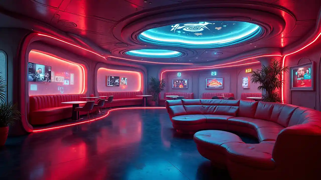 SavannahFuturistiskt inredning av UFO café. Inredning av främlingar, röda och blå toner