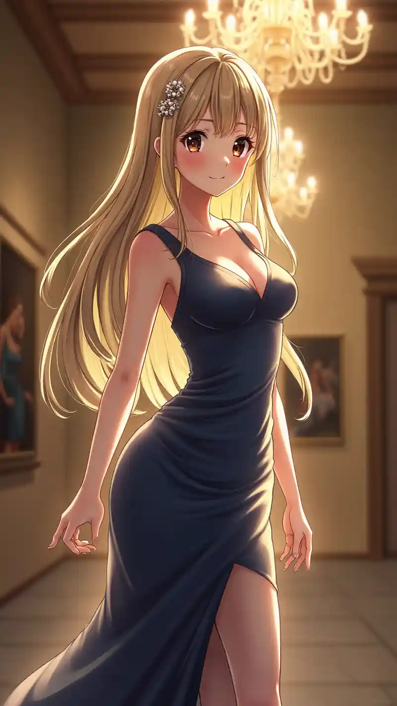 Vertical large-scale image of an Ultra HD anime girl, radiantly beautiful and sensual, illuminated by a chandelier’s light, standing in an indoor art gallery with classical paintings, wearing a luxurious evening gown with a plunging neckline and sheer sleeves, her long hair adorned with a pearl hairpin and a gentle smile, big shimmering eyes, glowing skin, deep gold and blue color palette, elegant features, flawless makeup, sophisticated and artistic vibes, warm lighting with a soft glow, emphasizing her alluring, well-defined chest with a subtle cleavage, and long, toned legs with a poised posture, exuding charm and elegance.