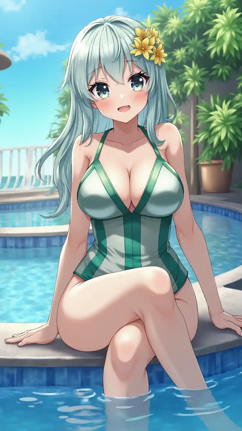 En vertikal storskalig bild av en Ultra HD-anime-tjej, förtrollande vacker och självsäker, som parkerar sig i solljuset, som vilar vid en utomhuspool med tropisk omgivning, som bär en metallisk baddräkt med en nedgångs hals och en blomsterhår, hennes våta hår som klamrar sig till hennes hud och ett själsförtroende leende, breda glitrande ögon, glödande hud, livlig blå och grön färgpalet, mjuka funktioner, perfekt makeup, lyxig och uppfriskande vibbar, mjuk glöd och naturlig belysning, som betonar hennes charmiga, väldefinierade bröst med en subtil dekolering, och långa, tonerade ben med en avslappad pose, som utstrått skönhet och självförtro.