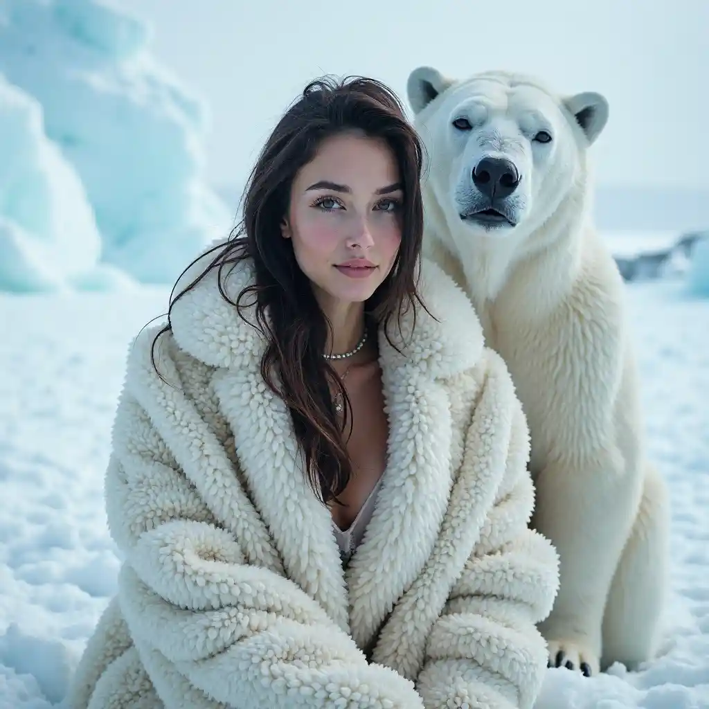 Porträtt av ung kvinna med mörkt hår och små bröst, sittande, tittar på kameran, bär en tjock vit päls, en stor isbjörn sitter precis bredvid henne, polar plats, is och snö, kall miljö, mycket detaljerad