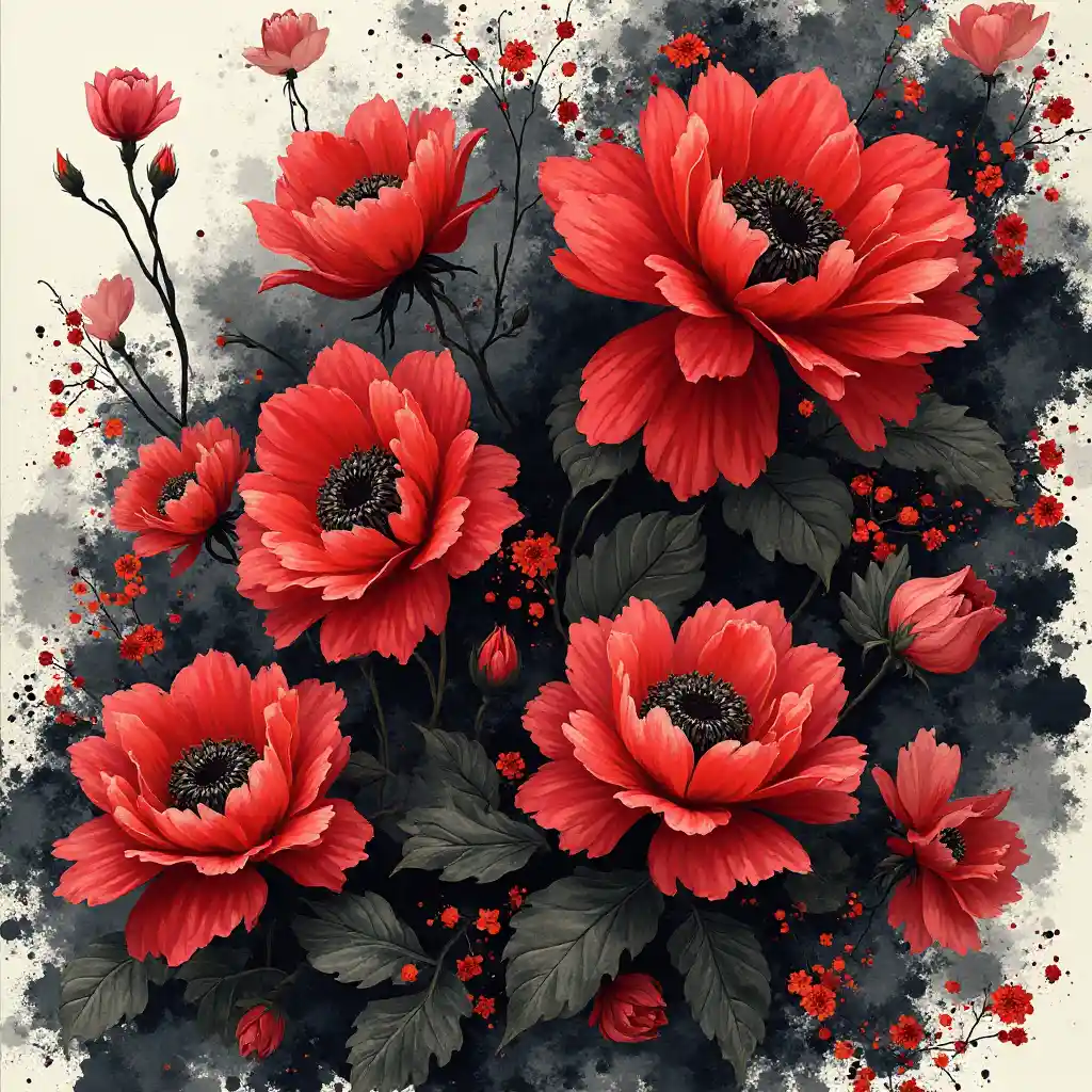 (digital vattenfärg abstrakt måleri), levande blommor, invecklade art nouveau mönster, (djärva penselsträckor), slående svart och rött färgpalett, dynamisk färgsplattr textur, frodig blomstransaktion, konstnärlig skick, nycklig atmosfär, (hög detaljerad), elegant komposition, rik djup -- perfekt för konstent och samlare.