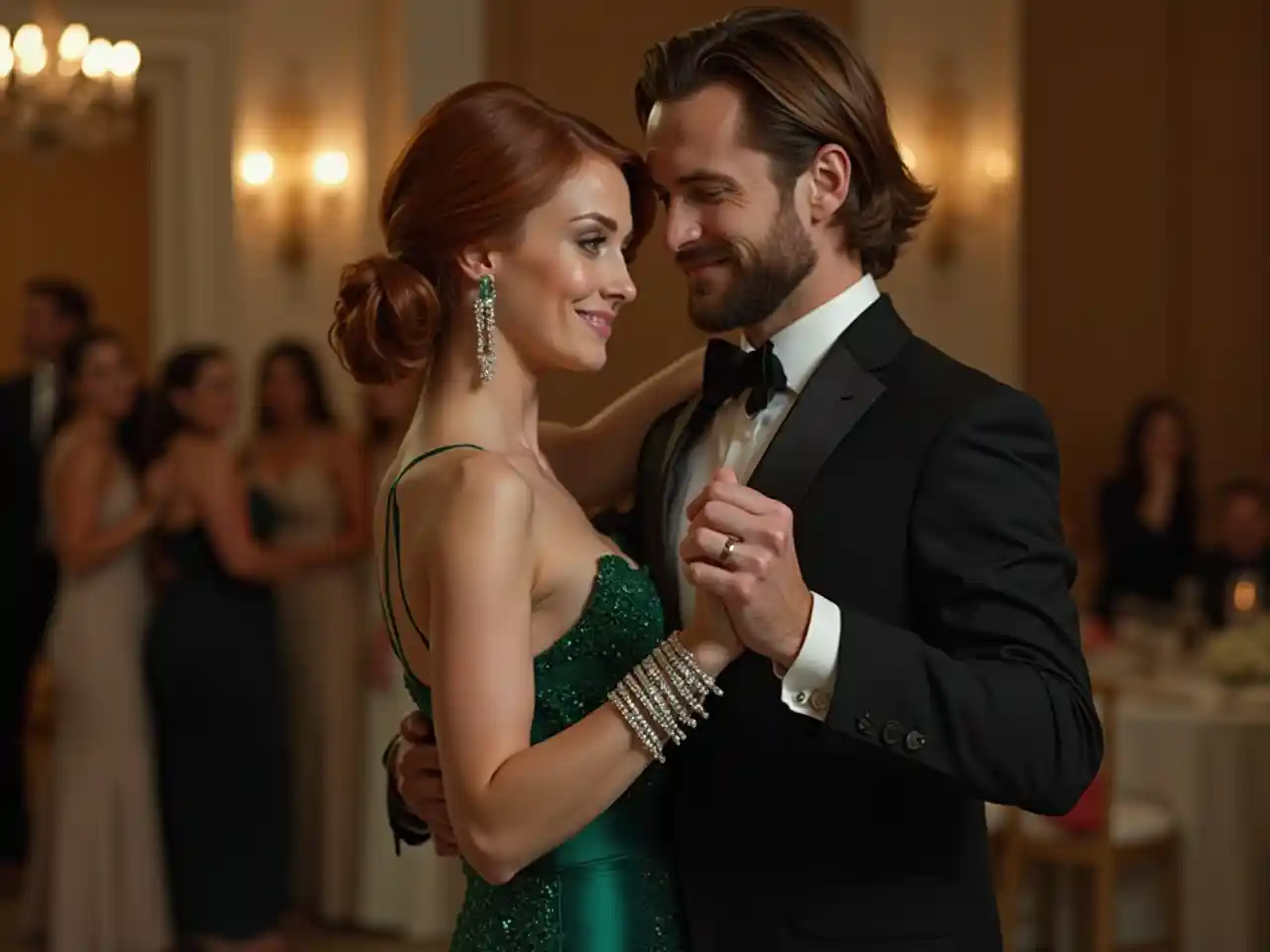 MaverickKvinna med brunt hår i grön kvällsklänning silver armband, smaragdsskor, man med brunt hår axellängd, skägg, smoking båda dansande i balsalen