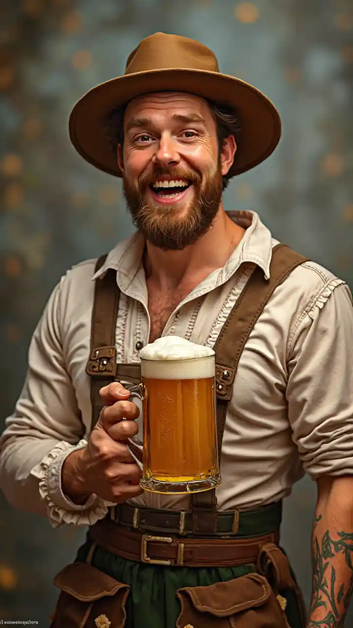 En bayersk man med en kopp öl, glad, traditionell tysk kostym, Oktoberfest, affisch