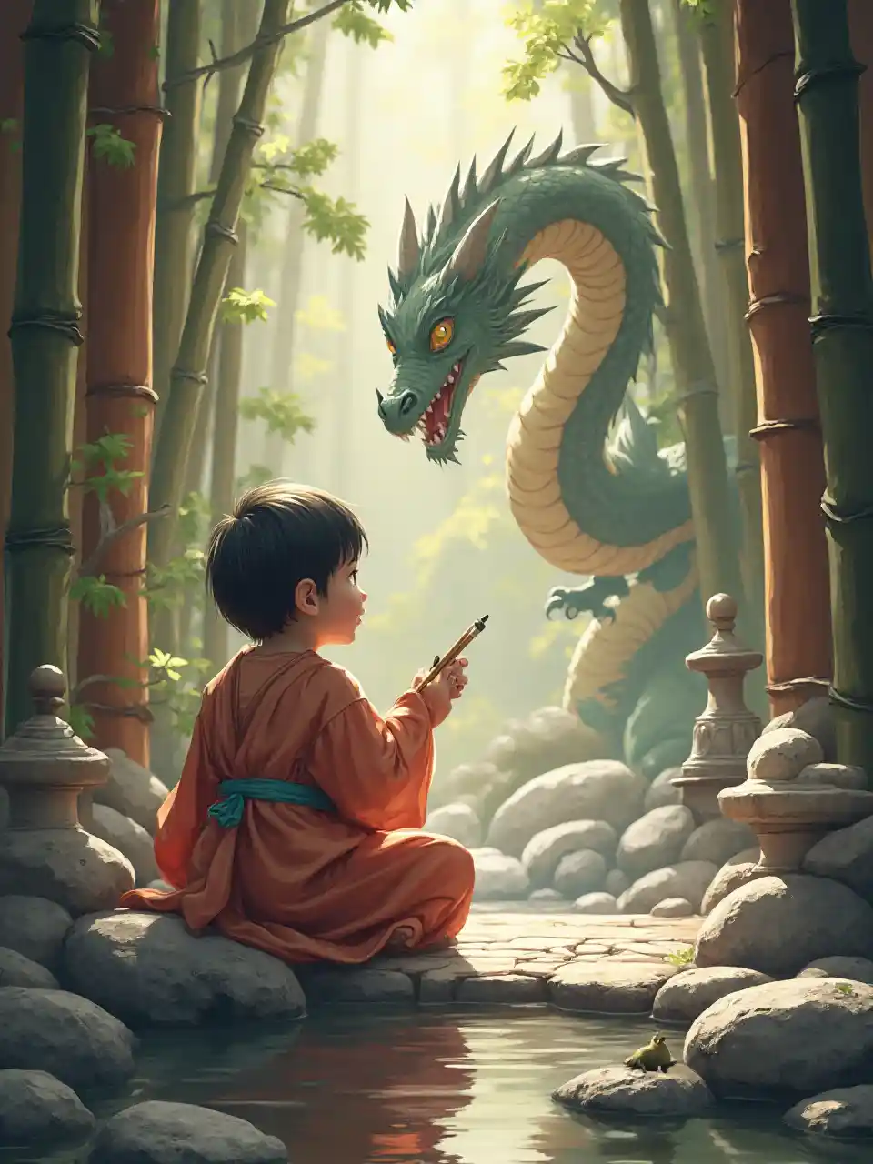 En 9-årig asiatisk pojke som ritar en drake i ett bamustempel bär en mantel med kranmönster. Stenlyktor och dimmiga dammar inramar honom, hans noggranna drag utstrålar kreativitet och lugnt fokus i en lugn, traditionell miljö.