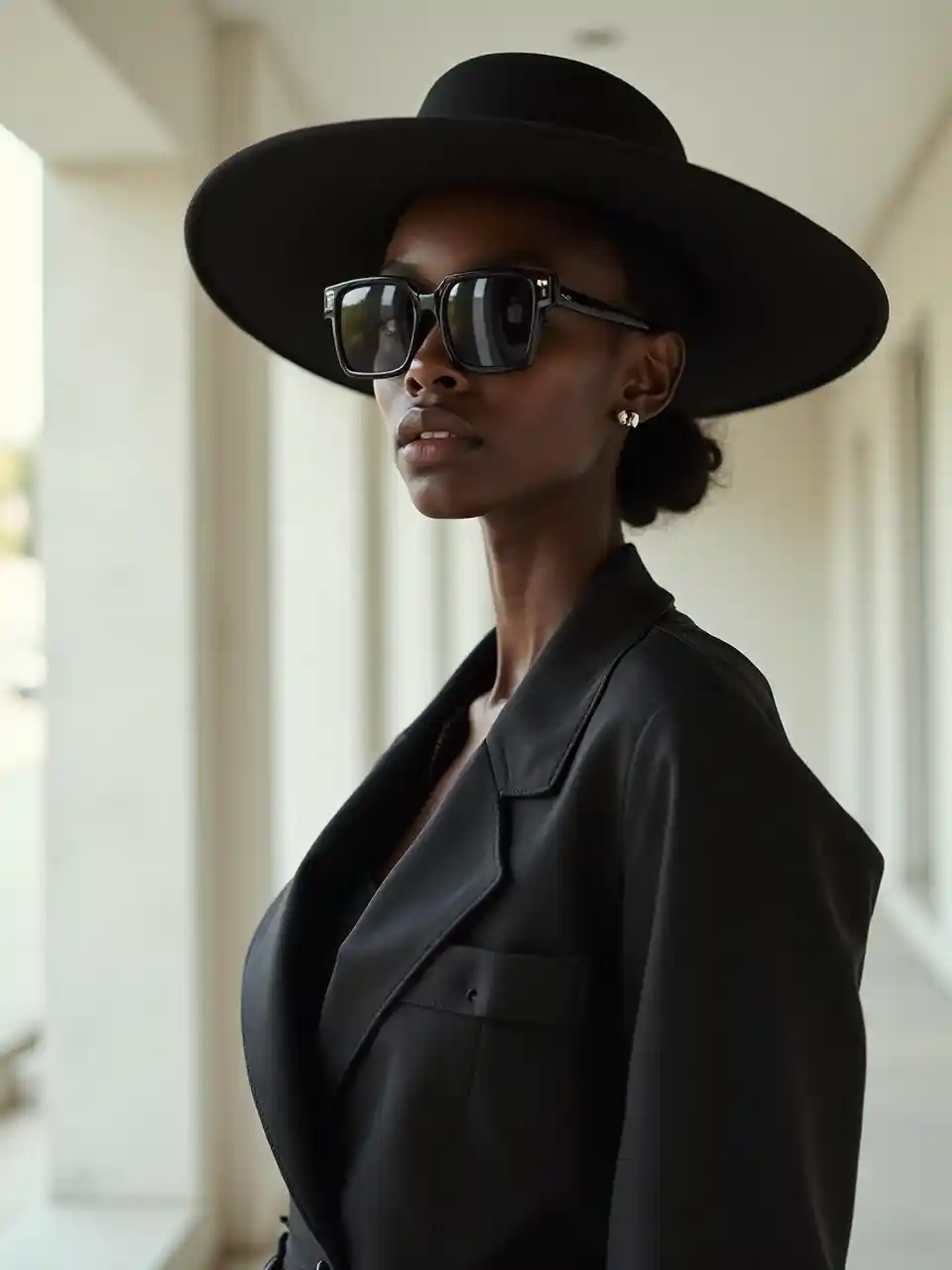 Modedesignarbete med en (Chanel) kvinnlig (nigeriansk) modell som bär minimalistisk kvinnoklädnad, bär en stor hatt och Chanel solglasögon, fotograferad i en Bauhaus-byggnad med ljus, kreativ en minimalistisk och elegant stil med en känsla av sofistikering och high-end känsla, fina linjer och invecklade detaljer, realistisk anatomi, Nikon D800
