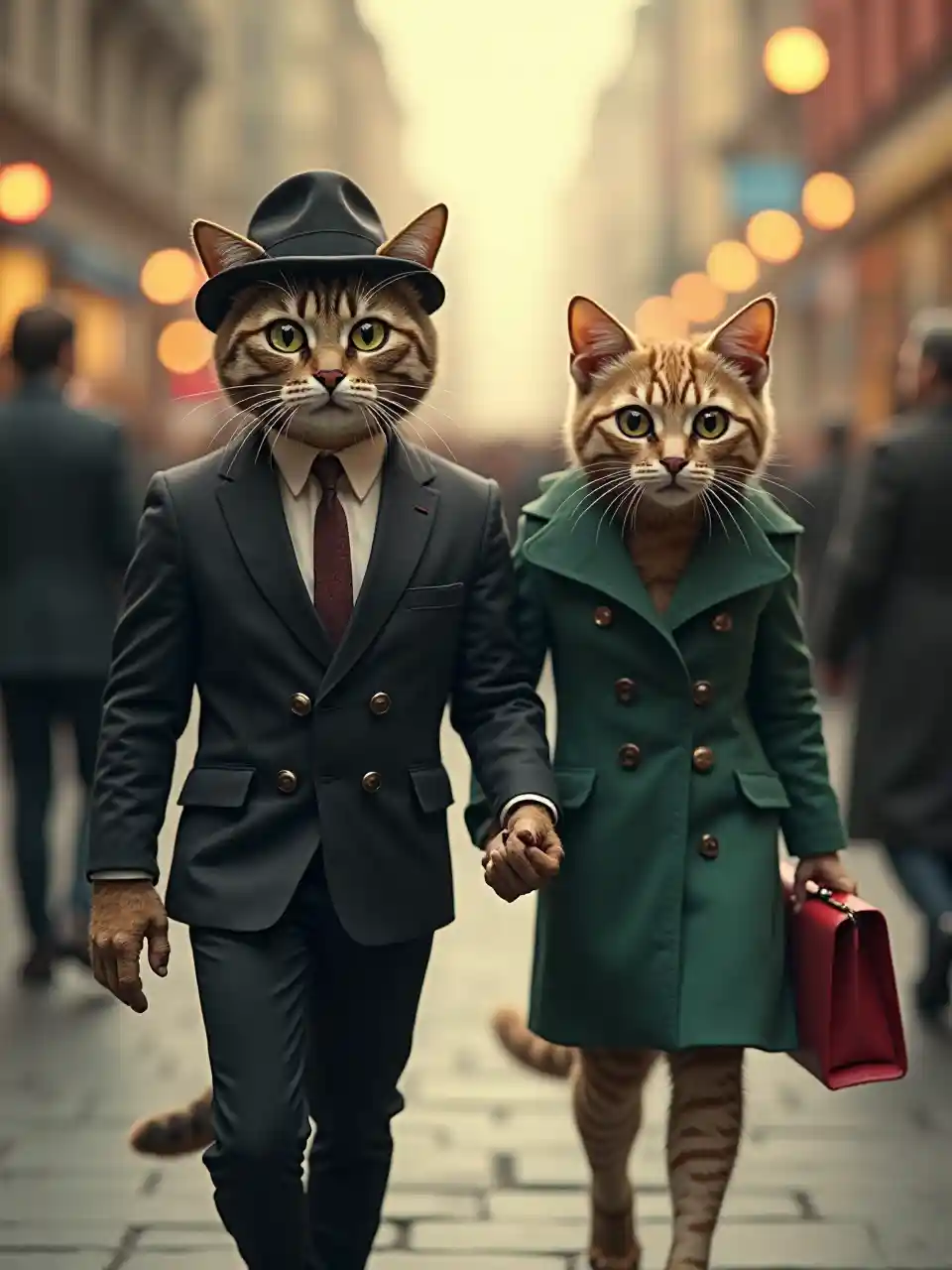 En extremt realistisk bild av en lång katt som håller en kattens hand, klädd i en formell kostym och en svart hatt, och en katt som bär en grön rock och håller en röd väska. Han går till jobbet. Dessa katters stora och uttrycksfulla ögon ger en känsla av spänning och äventyr när de rör sig genom stadsgator. Människorna bakom honom rör sig och är suddiga. Varma ljus och bokeh skapar ett magiskt glöd, samtidigt som det skapar en känsla av realism. Kontrasten mellan den skarpt fokuserade katten och den ofokuserade stadsbakgrunden skapar en realistisk överklagande, som kombinerar nyckel med en detaljerad, texturerad estetik. Den här fantasifulla bilden inbjuder tittarna att omfamna en värld.