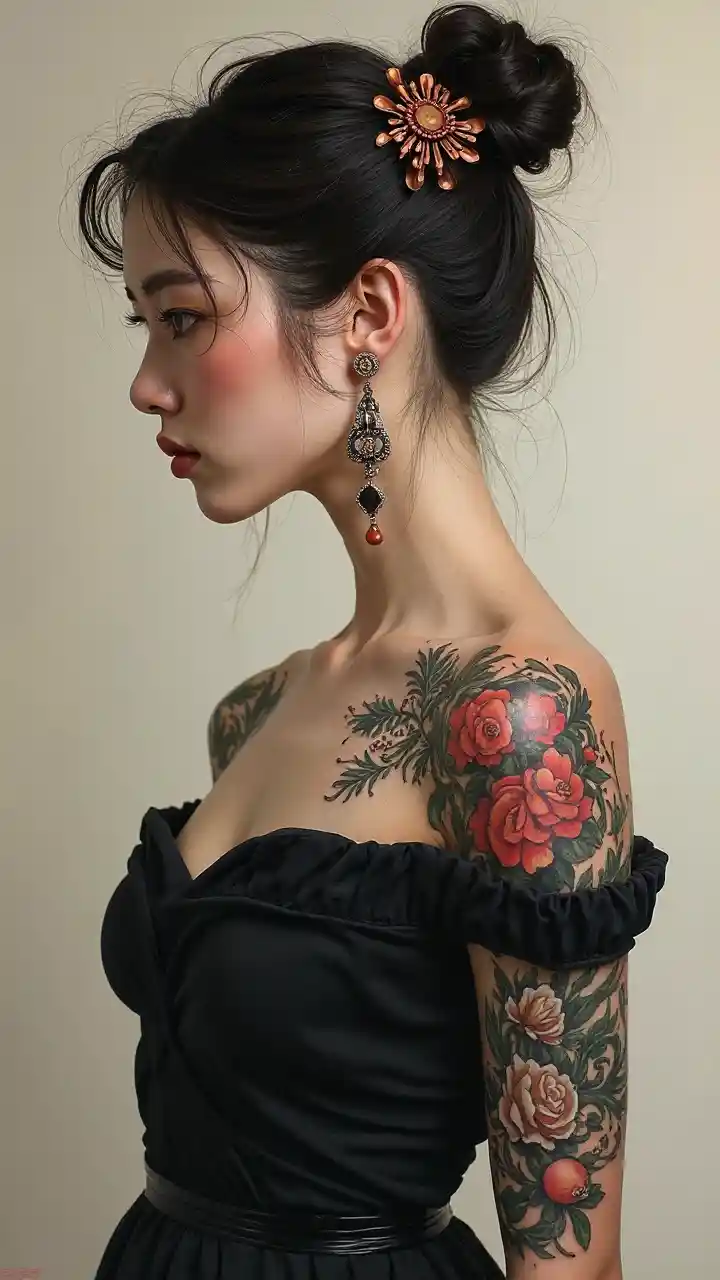 en kvinna i svart klänning med en blomma på axeln och en svart klänning med en blomma på axeln, Chen Jiru, figur, en tatuering
