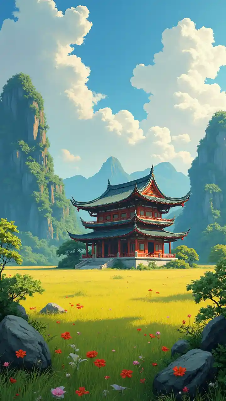 Rileylandskap av en kinesisk stil öppen paviljong i ett gräsfält, episk fantasi stil, nusantara vibrationer, livliga penseltryck som påminner om traditionella kinesiska målningar