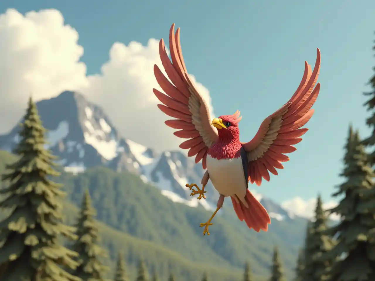 KinsleyEn fågel med rött huvud och vingar flyger i luften med träd i bakgrunden och ett berg i fjärran, Chris LaBrooy, sots art, fåglar, en 3D rendering