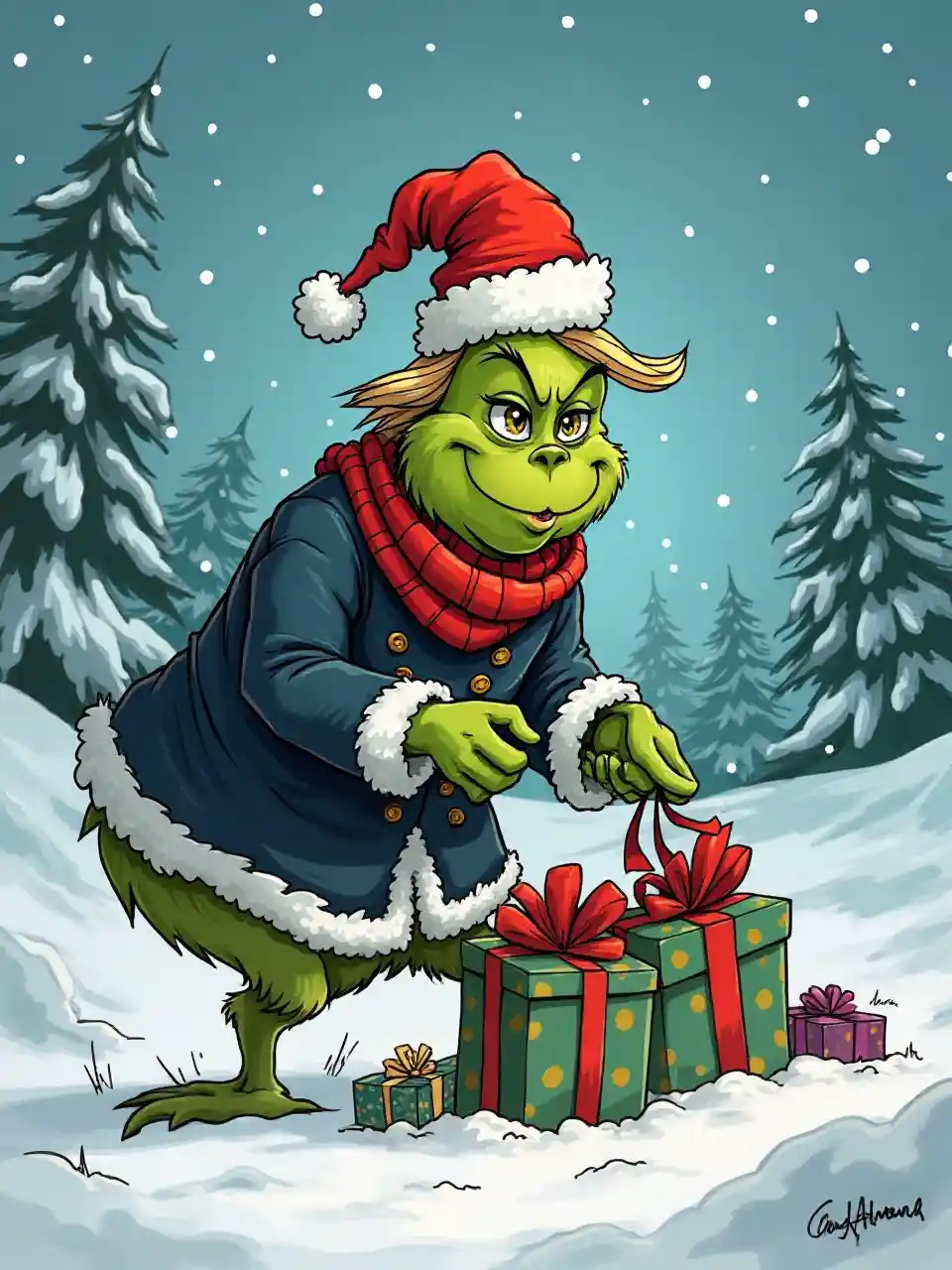 ColtonTecknad Donald Trump som Grinchen som stjäl presenter i en snöig julscen.