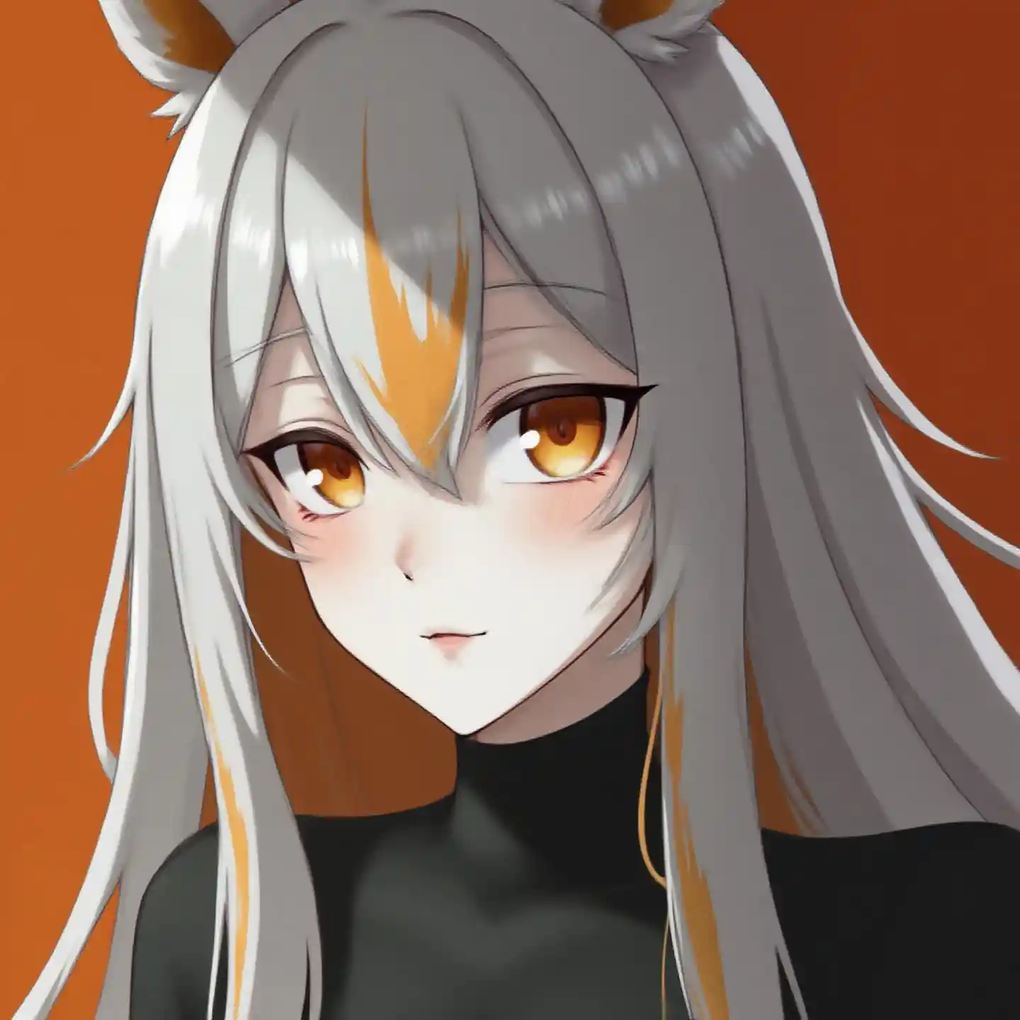 Scarlettscore_9, Aske, antropomorf kvinna, mänskligt ansikte, orange ögon, långt hår, tvåfärgat hår, vitt hår med orange streck, (vit hud:1.5), orans leppstift,