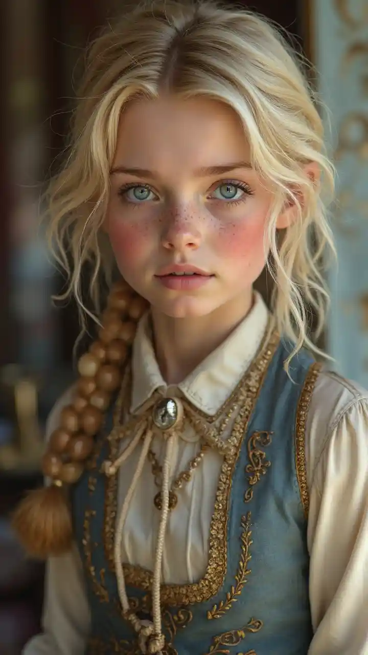 OliverBlond, blåögd flicka i klassiska kläder