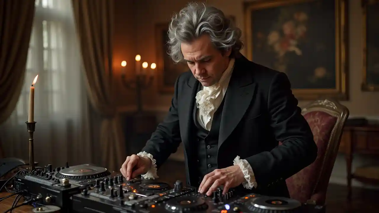 PeytonLudwig van Beethoven i en svart kostym från 1700-talet och musik på ett dj-bord