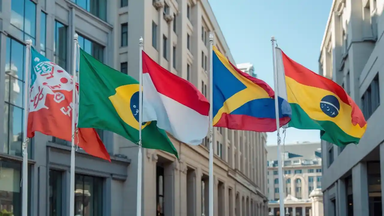 Flaggor från Nordamerika, Afrika, Asien och Latinamerika flyger utanför en byggnad
