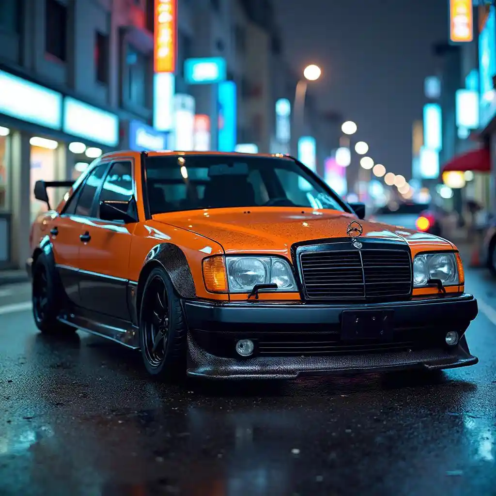 En orange och svart Mercedes w124, med karosseri av kolfiber, nedre och kolfiber spoiler, i Tokyo med blå och orange neon lampor