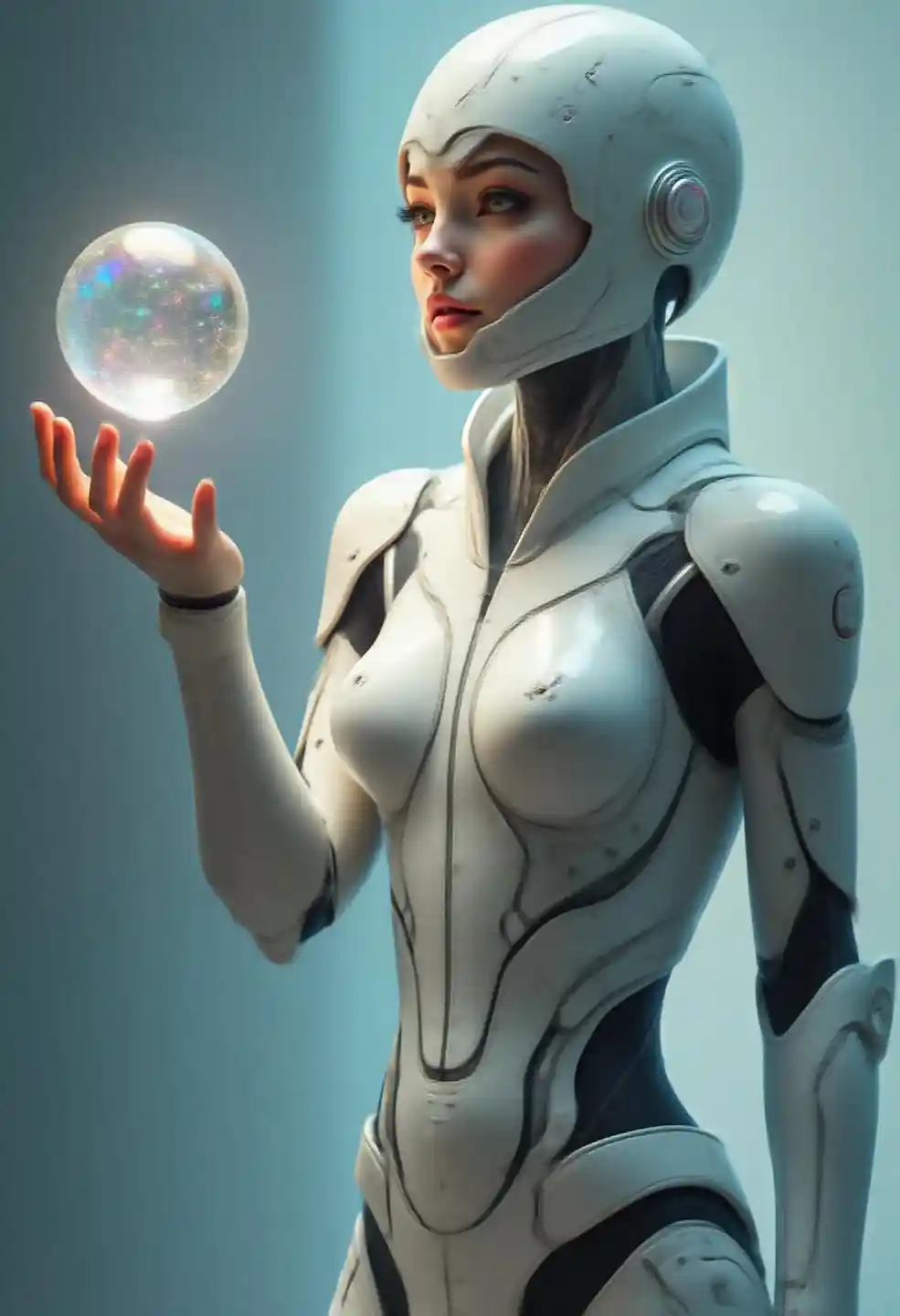 MiaEn fokuserad kvinnlig cyborg krigare i vit keramisk rustning utan ansikte kastar en helt genomskinlig glasboll mot tittaren, skimrande med regnbågen,