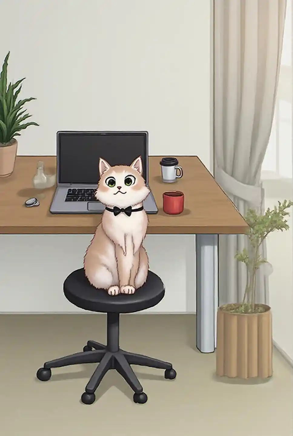 {{A ((sophisticated and well-groomed)) depiction of {((a dapper feline sitting confidently on a modern office desk))}}} with {((a neatly placed laptop, a cup of