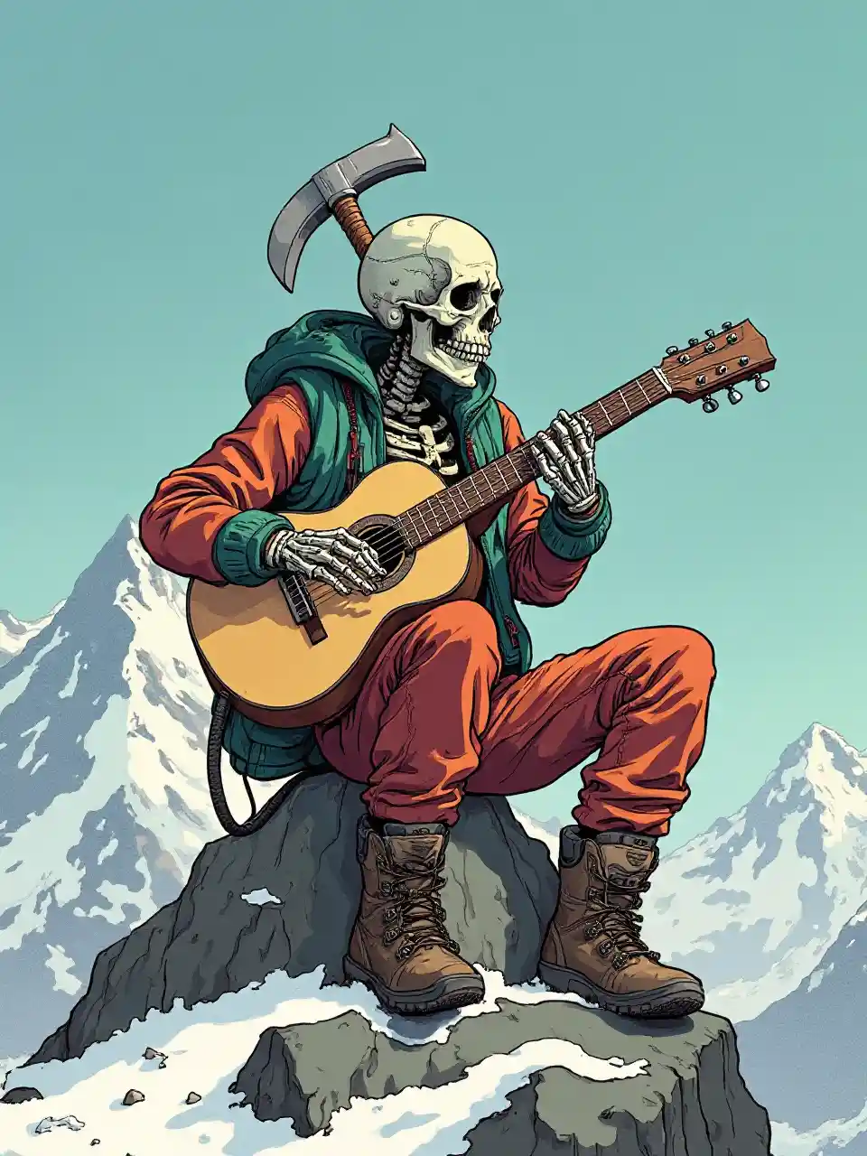 En död kropp spelar gitarr, sitter på en sten. Skelett, berg i bakgrunden. Klättringskläder, bergsklättringsskor. Is yxa fast i huvudet. Charles Bruns illustrationsstil