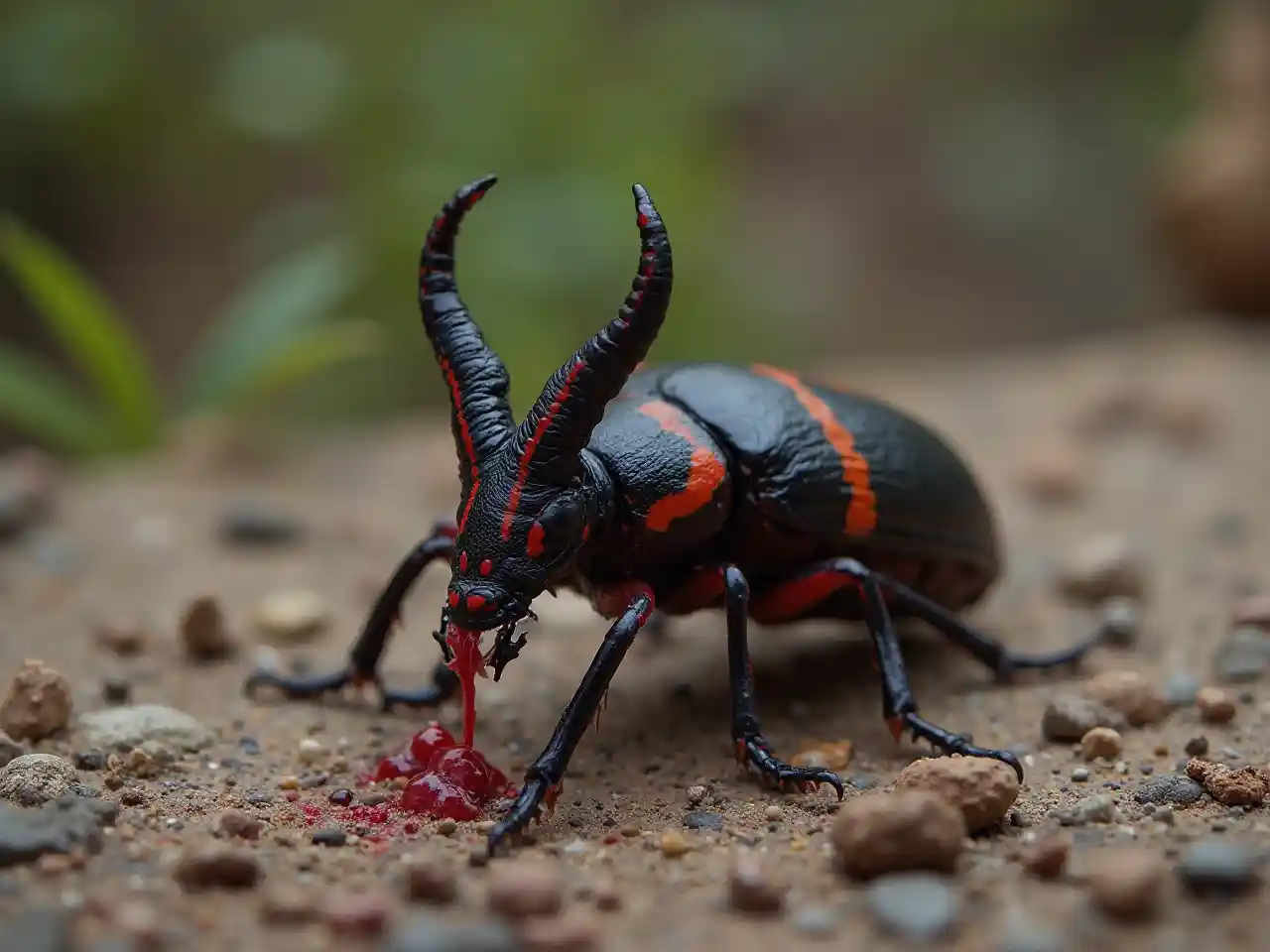 En 15 cm lång, 7 cm bred skalbagge med två horn som djävulens. Det är mitt i att spotta gift som ser ut som blod. Den har röda och gula streckar längs sin svarta kropp och har oändliga ögon.