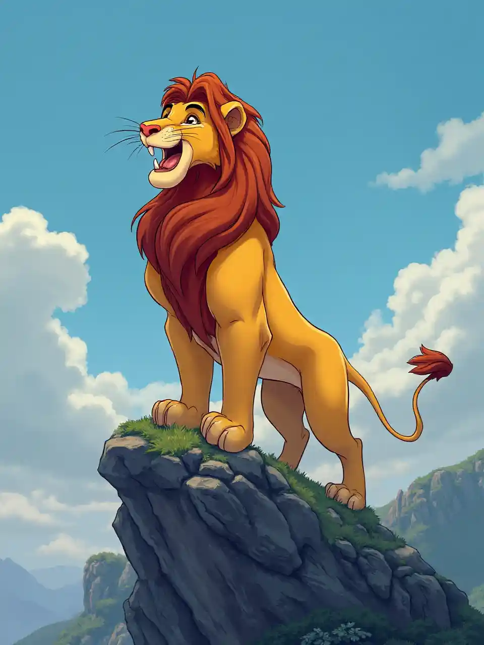 Scott"En majestätisk Disney-lejon som bråkar på en dimmig topp" Stil: Handritad Disney-animation