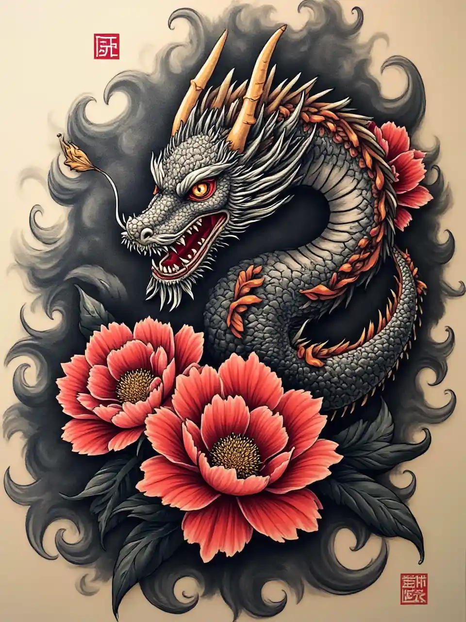 En tatuering i japansk stil med en vild drake som sveps om levande röda pioner mot en svart bläck. Draken är mycket detaljerad och utsmyckad, full av bländande ögon, skal och skarpa klor. De röda piongerna, som representerar mod, är i full blom med invecklade kronblad. De svarta bläckvågorna ger en dramatisk bakgrund och förbättrar konstens sammansättning. Designen förkroppsligar balansen mellan hot och skönhet, vilket är vanligt i traditionell japansk tatuering.