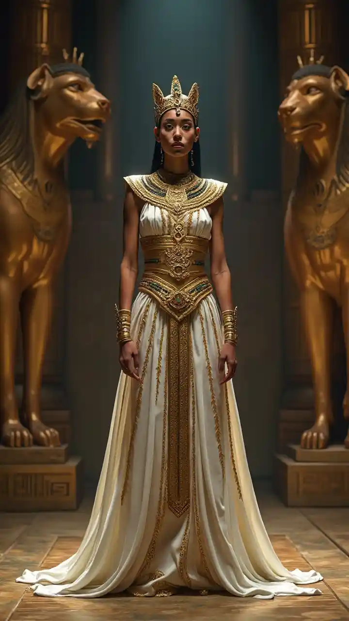 Bilden visar en kunglig person klädd i en väl utarbetad, klassisk egyptisk klädsel, inklusive en vit och gyllene klädsel med invecklade mönster, en huvudbeklädning som är dekerad med guld och flera armband. Figuren står i en stor, gammal egyptisk miljö, som kännetecknas av utsmyckade kolumner med hieroglyfer, en stor, majestätisk staty av ett lejon eller liknande varelse och ett svagt upplyst, överdågs interiör. Belysningen skapar en dramatisk effekt, och den lyfter fram figuren och den omgivande arkitekturen.