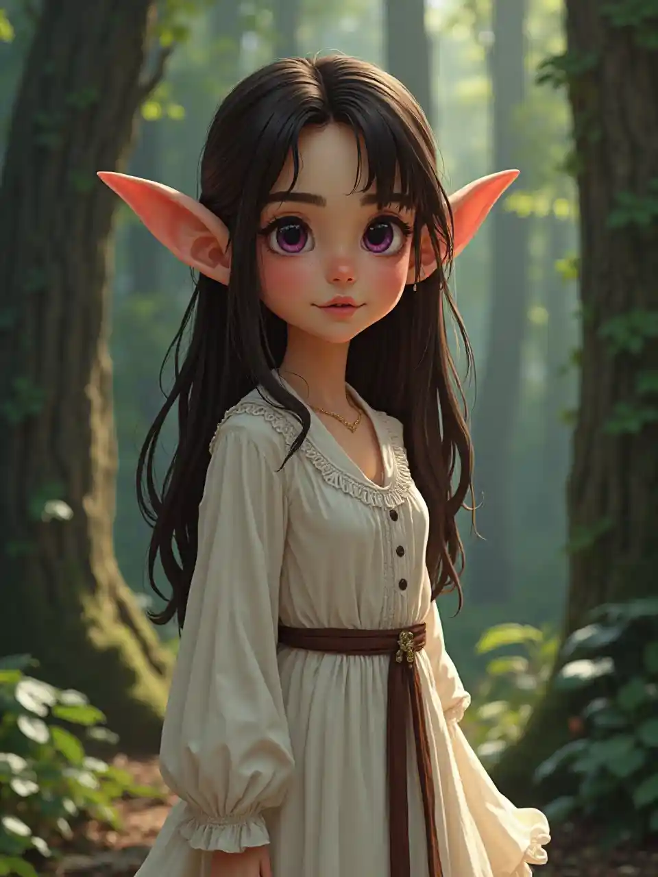 Ung tonåring med långt mörkt brunt hår, frimärkt, brun hud, lila ögon, elfsöron, buskiga ögonbryn, små, fulla läppar. Hon bar en lång medeltida, flytande, vit klänning och stod i en skog.