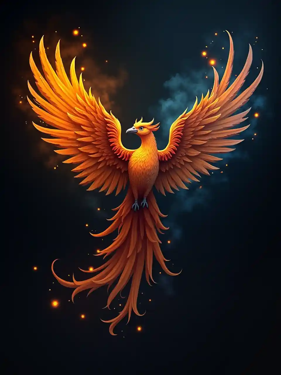 PianeerEn feniks med orange och blå vingar på svart bakgrund med eld och rök runt sina vingar, Chris LaBrooy, fantasy art, p, datorgrafik