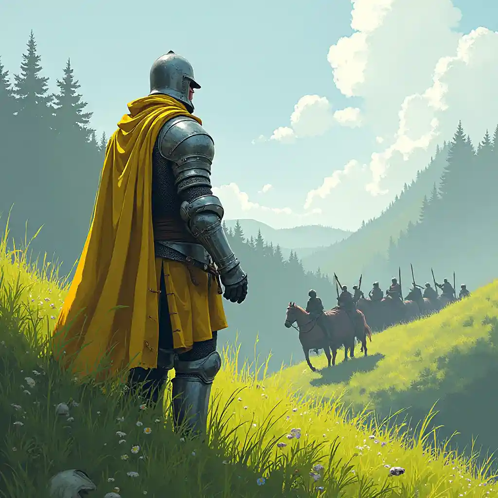 En illustration av ett grafiskt fantasybokomslag med en diagonal komposition med en ensam, slagdragen riddare till vänster om bilden som står i aktion poserar i ljus på en kulle täckt av ljus gräs. Riddaren har ryggen till åskådaren och bär ingen hjälm, fläckad kedje och en riven gul mantel. Hans högra arm är omsluten från axel till hand. I fjärran ligger en mörk skog med rökade silhuetter av krigare bland träden.