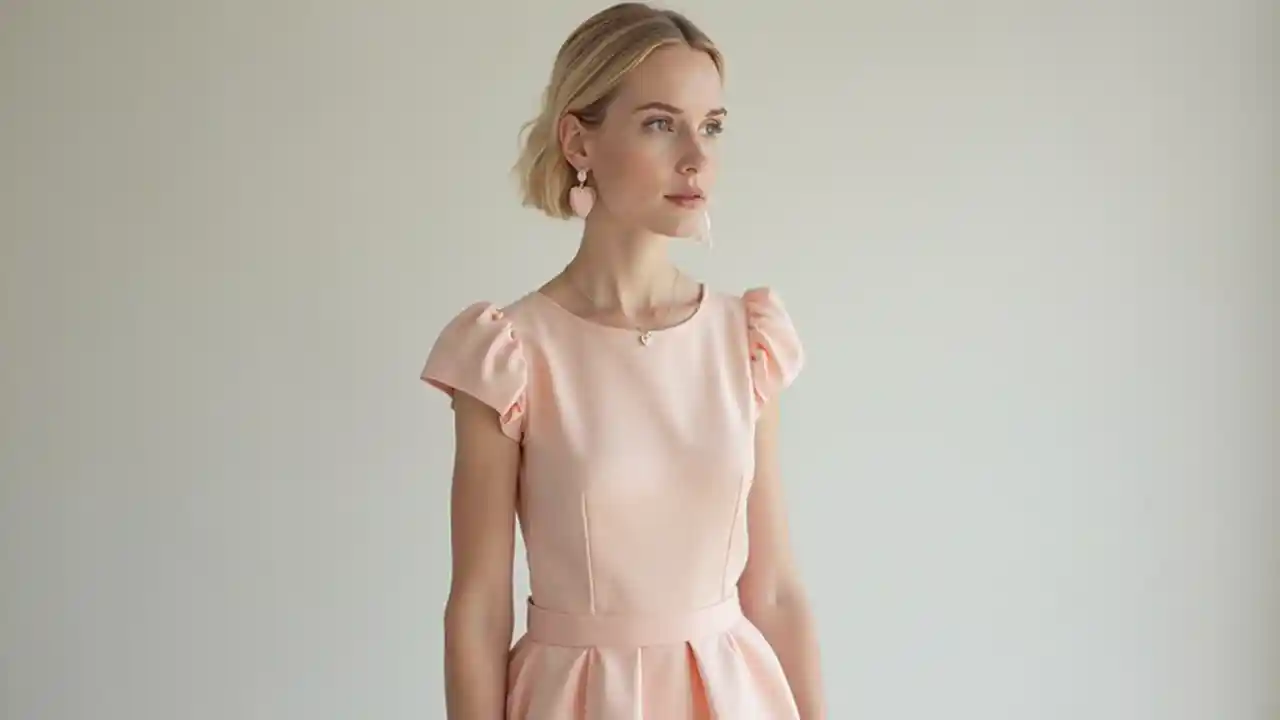 hyperfotorealistisk fullängdsmodeuppsättning fullängdsbild av en otroligt söt 20-årig kvinna med slickat bakåt blont hår inklädd i en snygg bob klädd i en mycket (((silk shantung klänning var en A-linje silhuett, som passar genom kors och som sprider sig i midjan till en full kjo som skulle träffa henne strax under knän. Den hade en halslinje och uppblåsta hattar.))), som accentuerar hennes (((fantastiskt proportionerade figur))) och drar uppmärksamhet på hennes (((skön tonad ben))), rosa hjärtsformade hängande örhängen, enkla hängskålar. hon poserar avsla