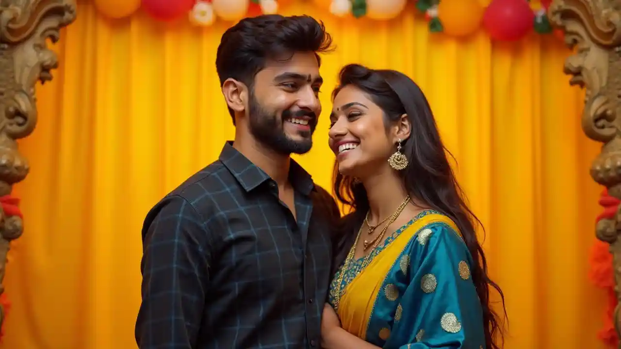 Set against a vibrant yellow backdrop adorned with colorful decorations, two young individuals stand close together, exuding a joyful atmosphere. The man, dressed in a dark plaid shirt, displays a relaxed smile, while the woman beside him radiates happiness in her elegant traditional attire, featuring a blue and yellow saree complemented by jewelry that catches the light. The scene is richly detailed, with intricate carvings and warm, inviting lighting that enhances the festive mood, suggesting a celebration or special occasion. The overall composition draws the viewer’s eye to the couple's expressions, encapsulating a moment of shared joy amidst the festive surroundings.
