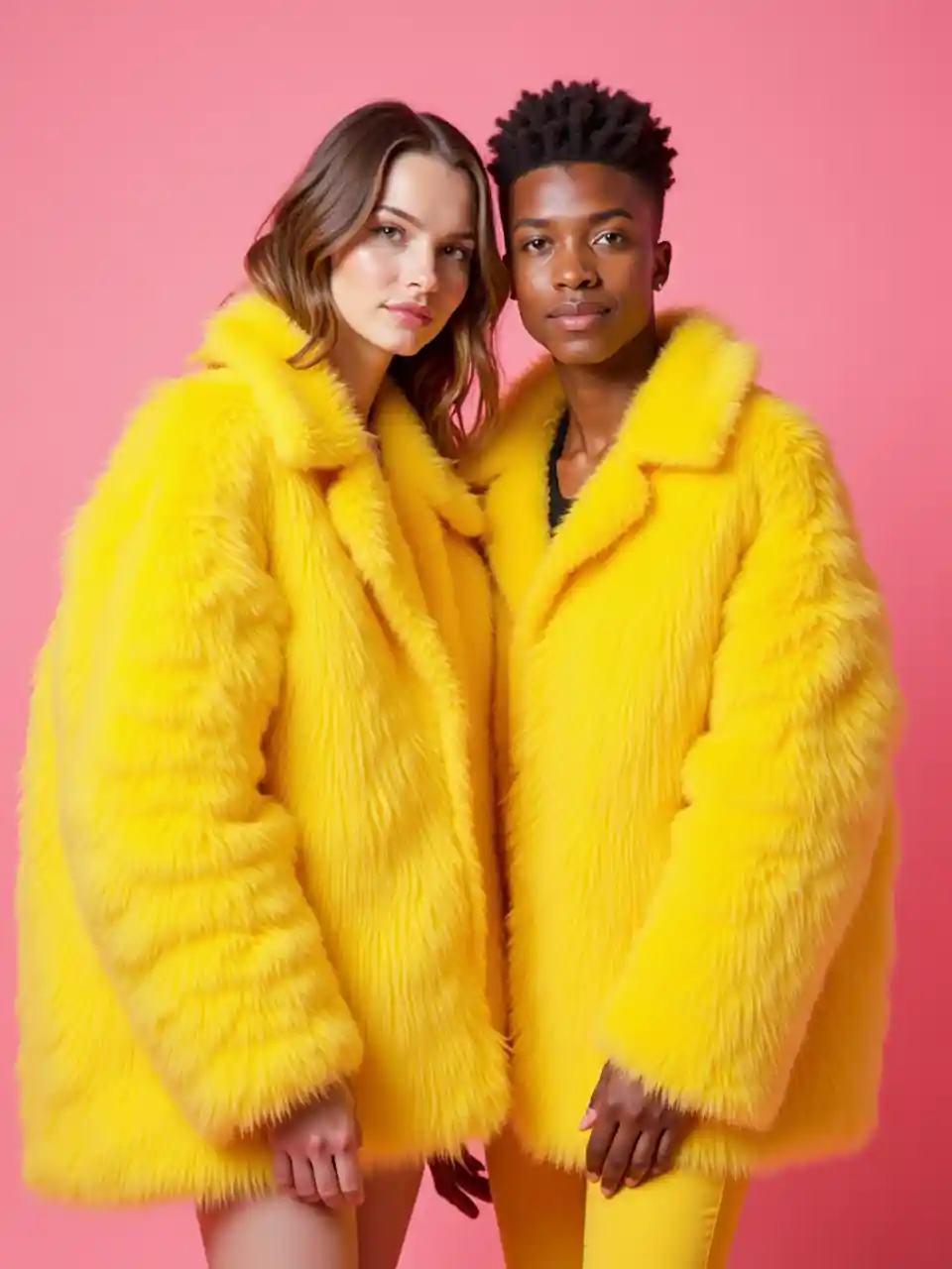 JonathanMan och kvinna bär en mycket fluffig jacka, gula fluffiga jackor, på en rosa bakgrund, ljusa färger