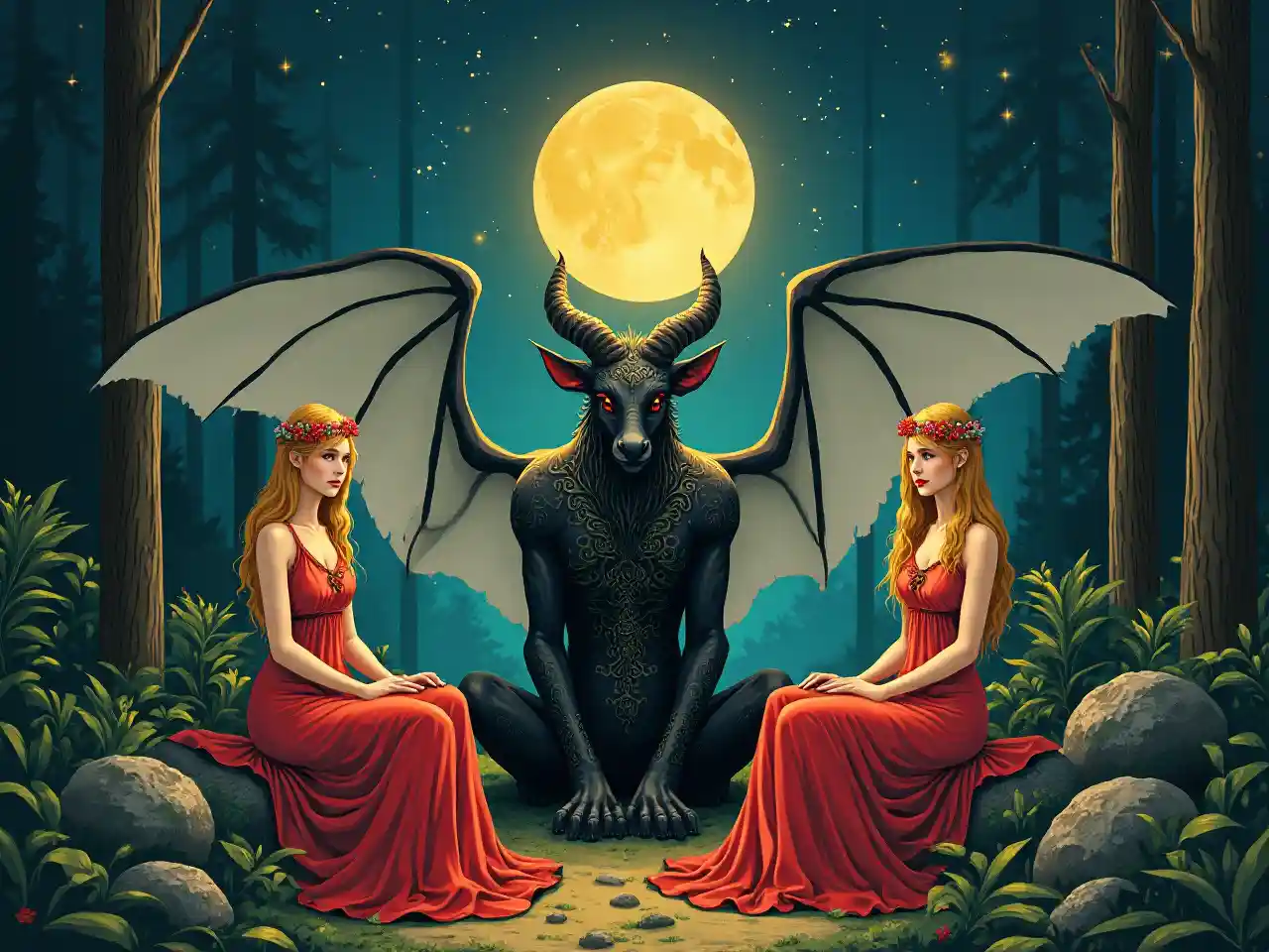 En mystisk illustration som utspelar sig i en skog under en stjärnig natt. I mitten, djävulen, utsmyckad med stora vita vingar och ett svart getliknande huvud med framträdande horn. Djävulen sitter mellan två kvinnor klädda i röd. Kvinnorna har långt, gyllene hår och är smyckade med blommor. De är placerade symmetriskt, med en till vänster och den andra till höger. Skogen är tät med höga tallträd och marken är täckt av stenar och grönska. Överst lyser en halvmåne och förskönar den eteriska atmosfären. Hög kvalitet, Illustration, Gyllene accenter, Detail, Textured, Dramatisk belysning, Varm belysning, Drömmande belysning, Fluid, Dynamic, Gradienter, Cinematic, Organic, Hyperrealism, Masterpiece, Film Grain, Ethereal, Sparkles, Fantasy, Vintage, Mystical, Magical, Light, Dust, Grain, Light Particles, Textur,Dark fantasy, Grainy texture,LightFantasy,#bakstyle