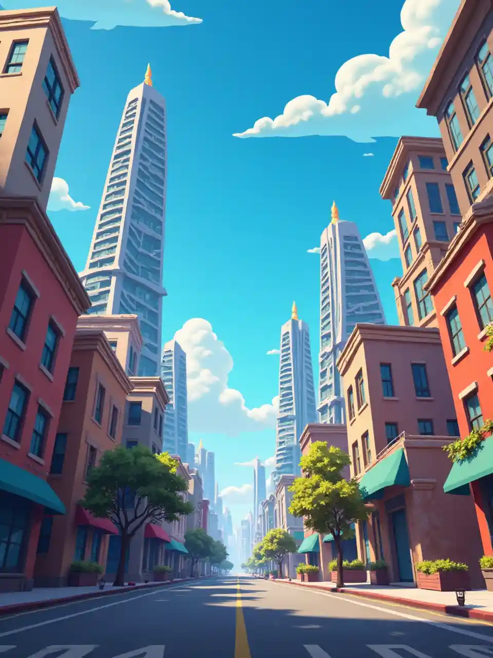 OliviaEn stiliserad stadsgata med byggnader som liknar Tilted Towers från Fortnite under en blå himmel.