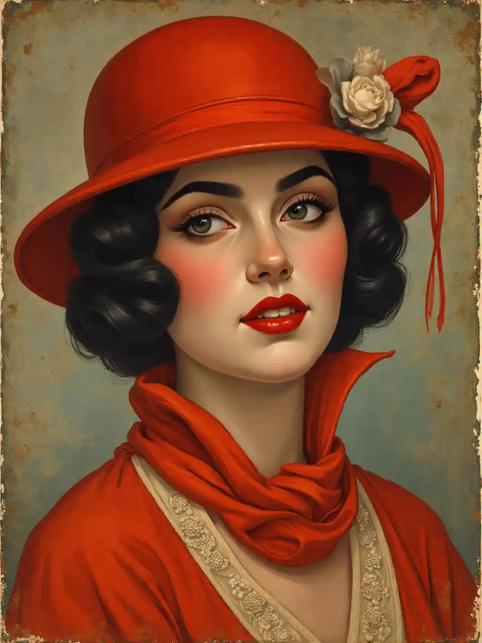 HenryFrida Khalo i röd hatt och halsduk i ett bildskåp, 1920-talets markant färg, 1920-talets reklam, 1920-talets klädhår, J C Leyende 8 K, J C Leyende 8 K, J C Leyende Cker. Svart hår