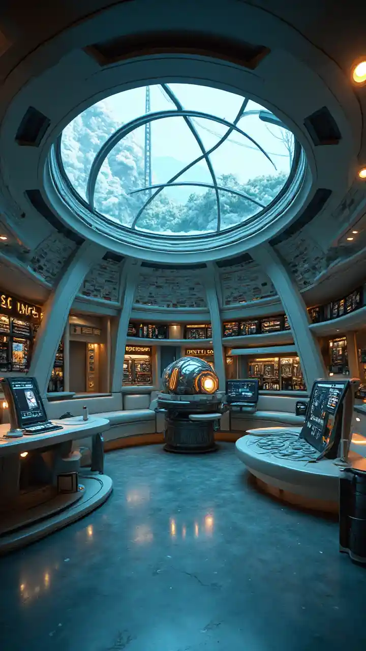 SophiaEn futuristisk inomhuskammare med en stor tidsmaskinkonsol och ett glaskupol.