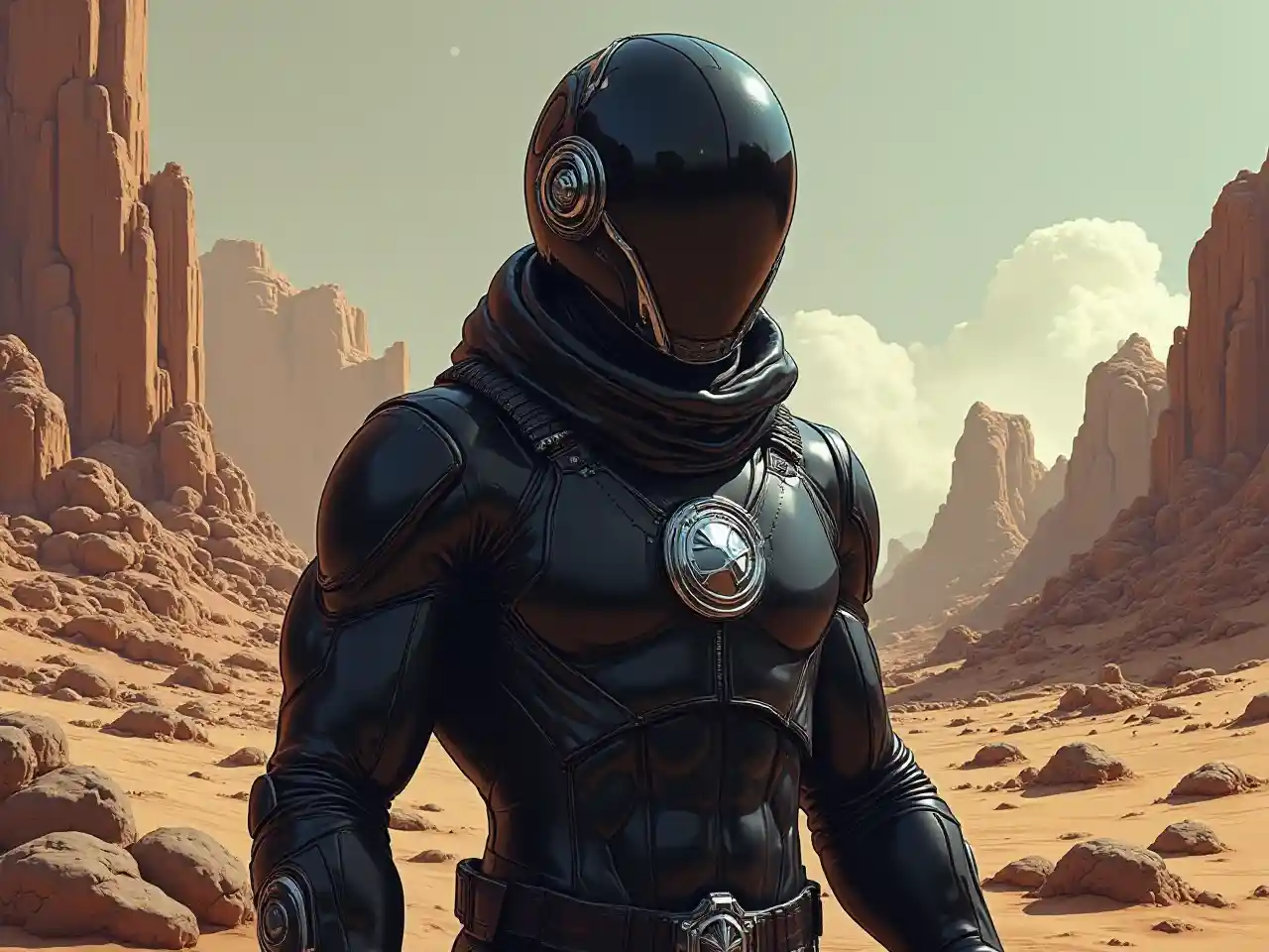 En man med en stark, muskulös kropp, som bär en elegant, hudtätt (retrofuturistisk) svart läderdräkt med en löst öppen topp och en tätt, mycket detaljerad och symmetrisk placerad bricka på bröstet, vilket återspeglar en futuristisk design estetik. Hjälmens silhuett och det robusta terränet på en avlägsen planets yta, med sina mycket detaljerade, symmetriskt ritade detaljer, förkroppsligar en stark kontrast.