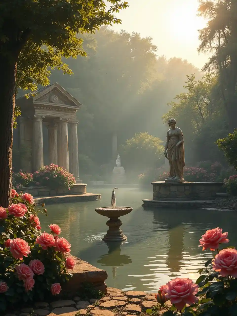 en rosenträdgård , en fontän , en Afroditasstaty , en damm , grekiska kolumner med förstörda bågar , dimma , gyllene sol